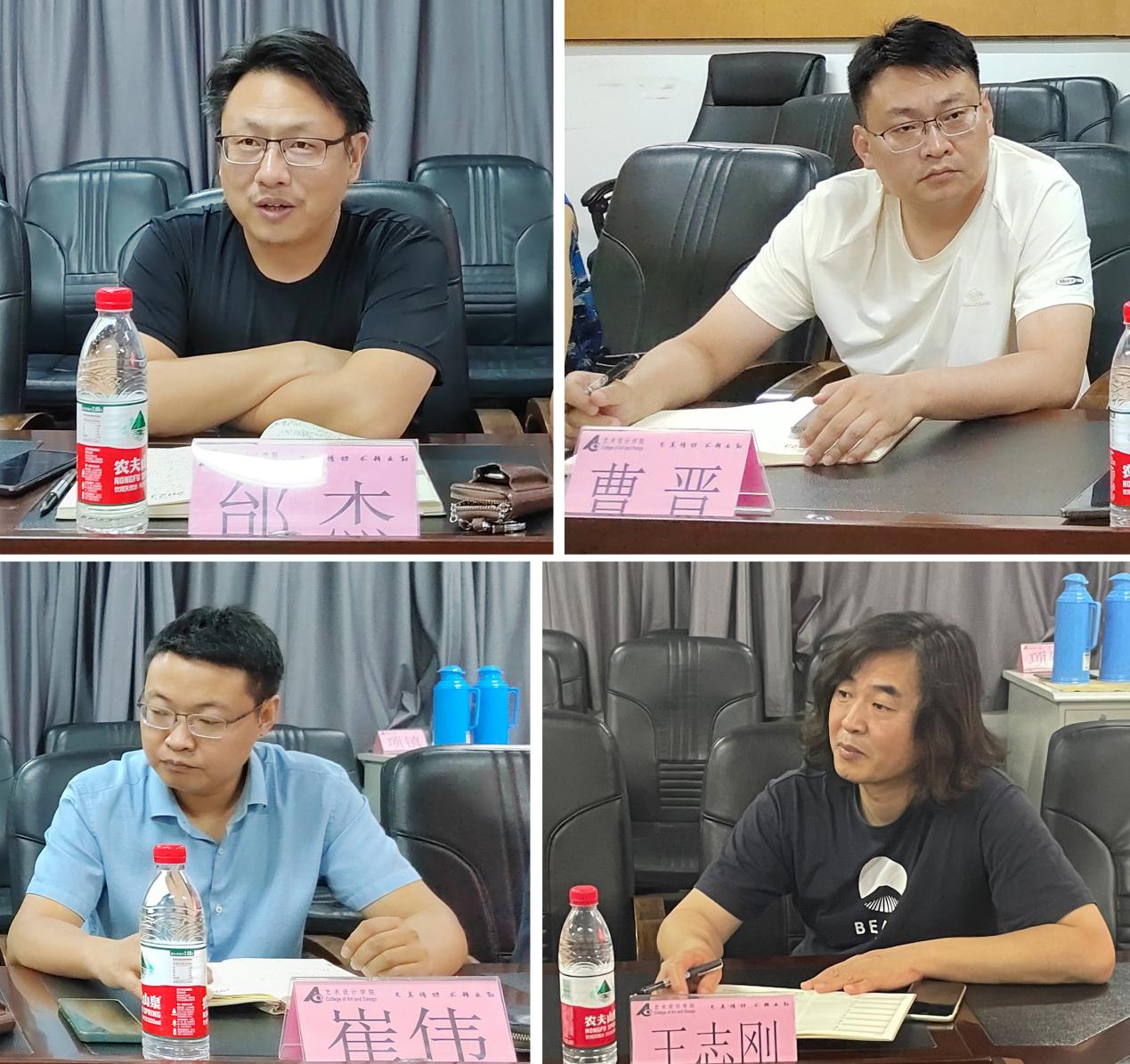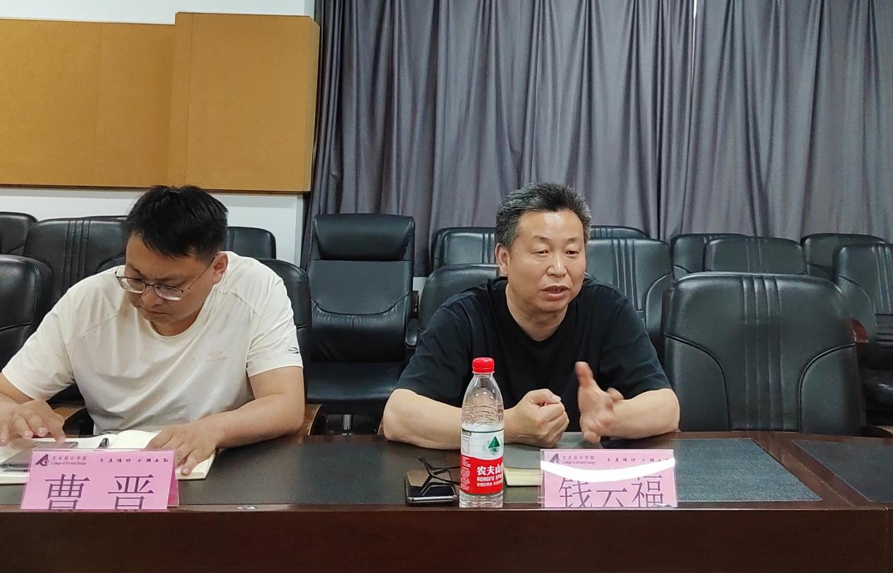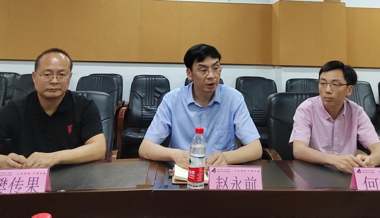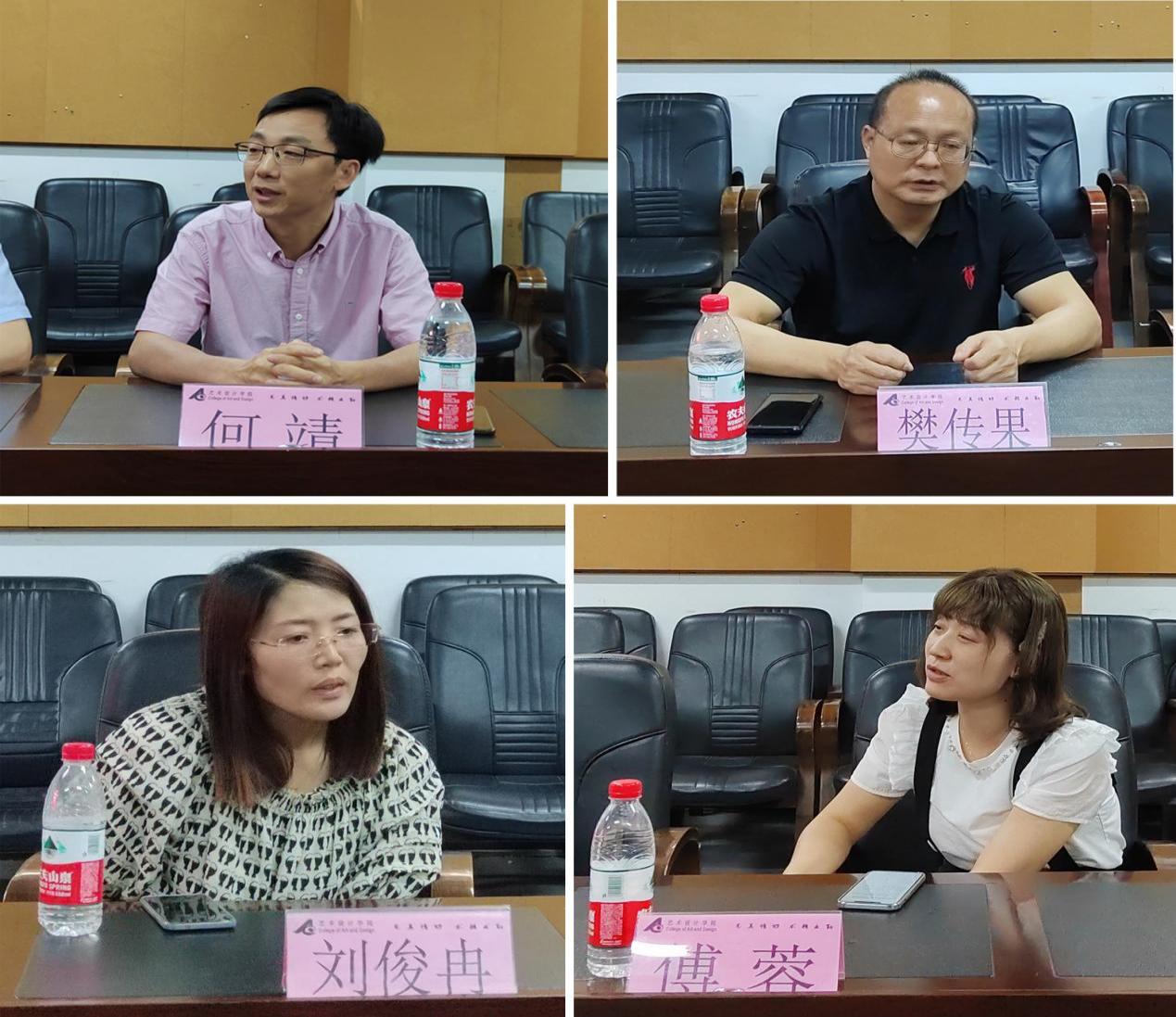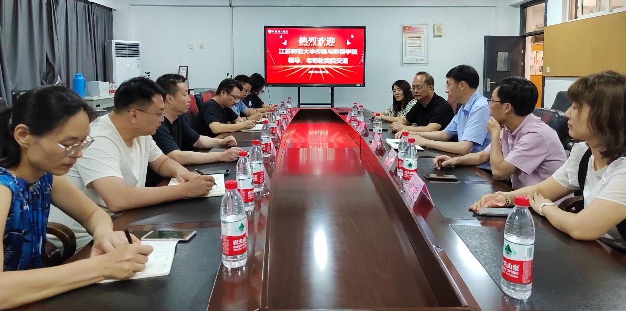 2023年6月29日下午,江苏师范大学传媒与影视学院党委书记赵永前、副院长何靖、樊传果教授、广告系主任傅蓉、广告系书记刘俊冉一行来我院进行交流,学院党政班子领导、视觉传达系主任王志刚、产品设计系骨干教师滕佳华以及部分教师代表参加活动。