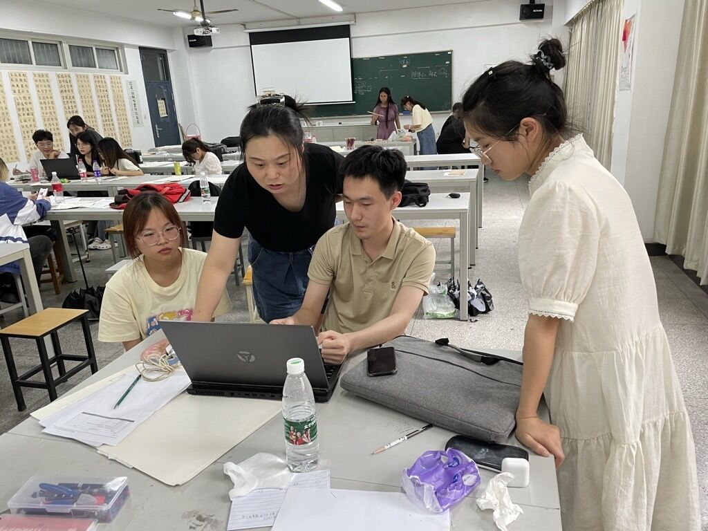 从左往右依次为许园春老师、邰杰老师、颜亮一老师、周蓓老师正在与A组学生探讨设计要点
