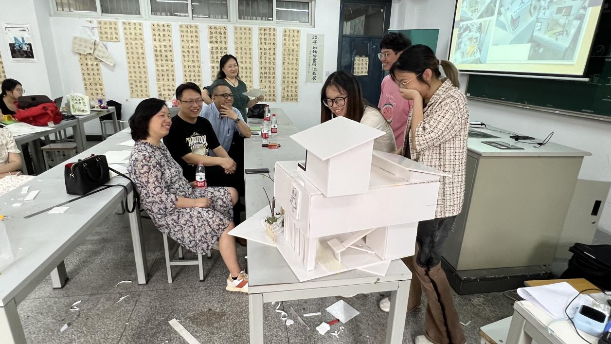 邰杰教授与颜亮一教授针对C组学生作品进行深入探讨 D组同学在作品前合影