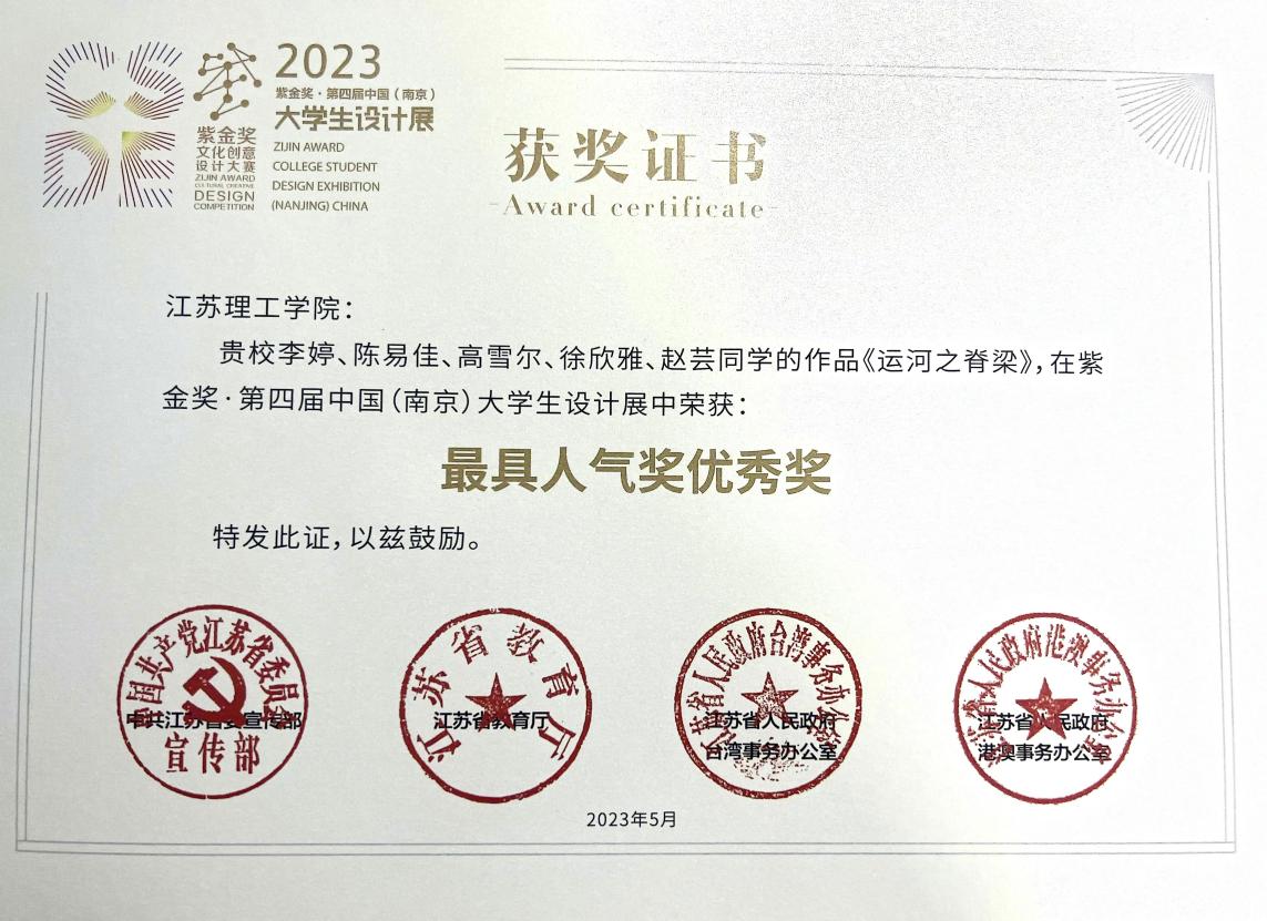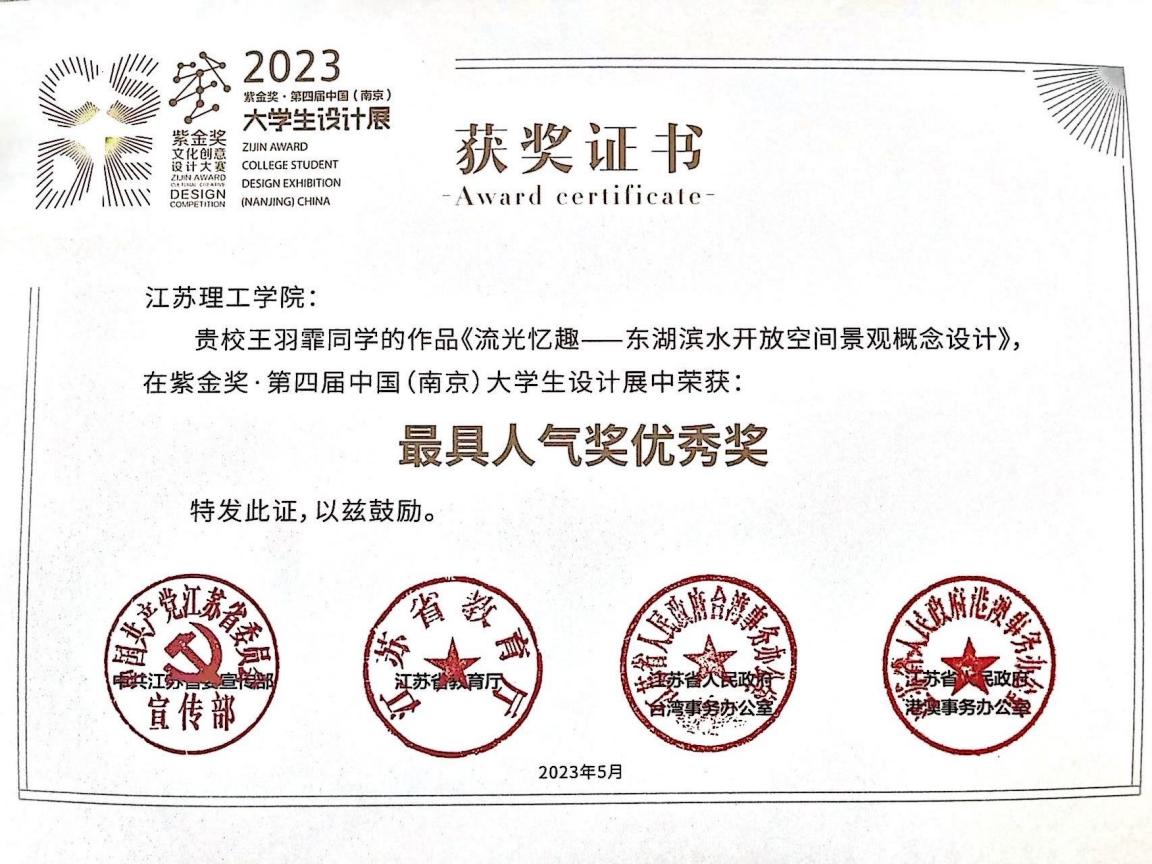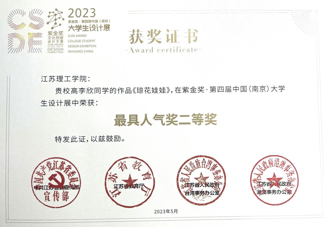 我院精心组织,认真筹备,遴选出百余项作品参加紫金奖大学生设计展,涵盖服装与服饰设计、环境设计、视觉传达设计、产品设计等专业,全面展示了我院学子的学习创作成果。最终,高李欣的《琼花娃娃》作品入选最具人气奖二等奖,王羽霏的《流光忆趣—东湖滨水开放空间景观概念设计》、杨涵雨的《源远流长—华东东湖滨水开放空间景观概念设计方案》、李婷等的《运河之脊梁》共3件作品入选最具人气奖优秀奖。