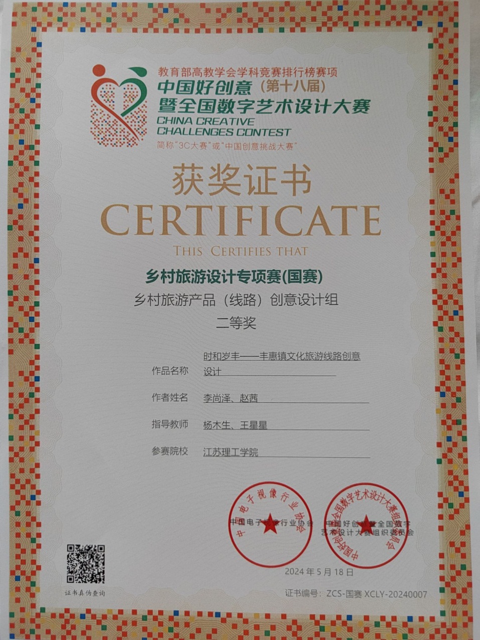 2024年5月18日, 第18届中国好创意暨全国数字艺术设计大赛“创游天下,文旅共赢”乡村旅游设计专项赛在武汉商学院举行。教育部高教司文科组原处长、二级巡视员张庆国,教育部高校旅游管理类专业教指委副主任委员、湖北大学旅游发展研究院院长马勇,教育部高校旅游管理类专业教指委委员、广州大学教授张河清,教育部高校旅游管理类专业教学指导委员会委员、武汉商学院旅游管理学院院长薛兵旺等领导专家参会。由我院选送的《时和岁丰——丰惠镇文化旅游线路创意设计》师生作品获得全国二等奖。