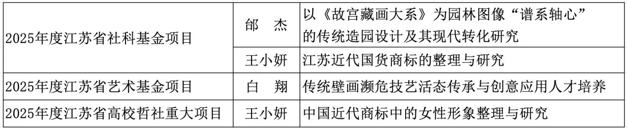 近日,江苏省哲学社会科学办公室、江苏省文旅厅、江苏省教育厅分别公布了2025年度立项名单,艺术设计学院共获批高层次社科研究项目4项(如下表),其中省社科基金年度项目2项,省艺术基金项目1项,省高校哲社重大项目1项,取得近年来我院科研发展新的突破。