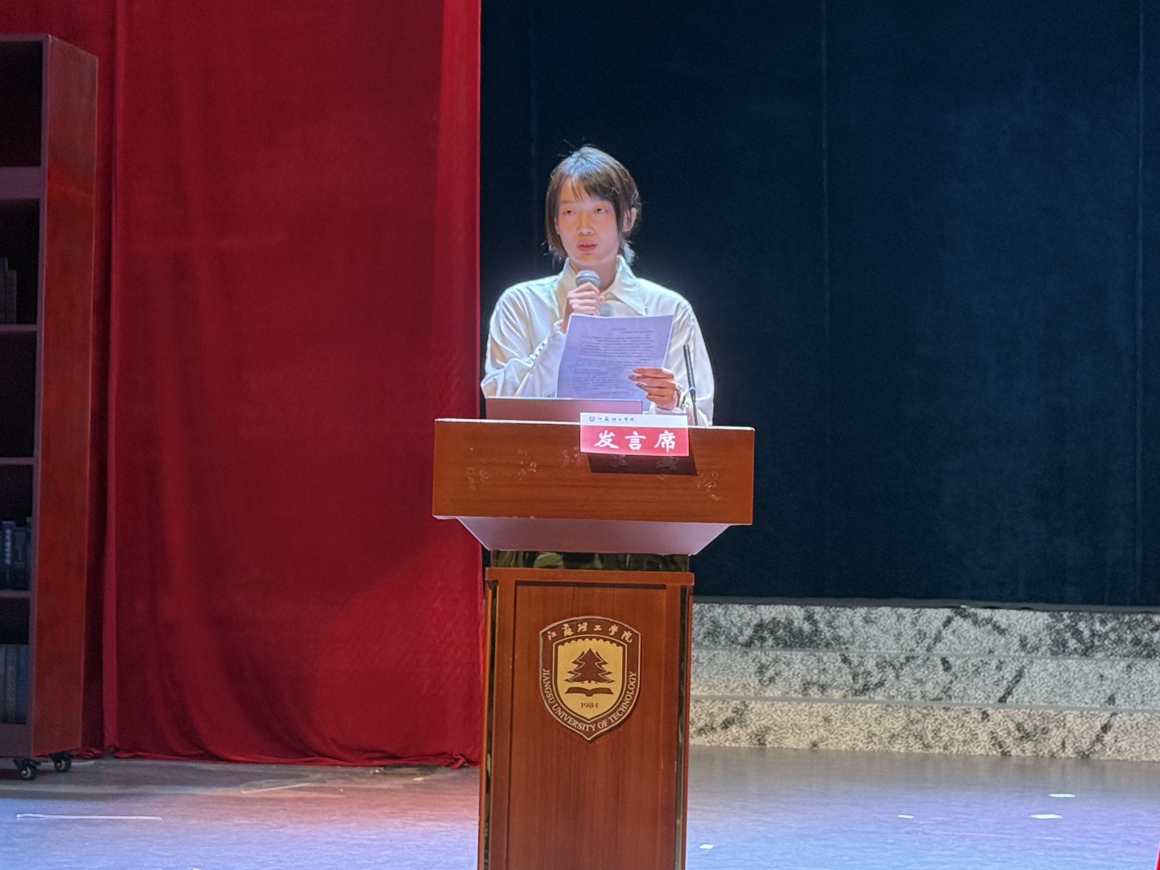 25研设计1班富静宜作为研究生新生代表上台发言。她从明确目标,向下生根;学会拥抱对待学习科研的热情,对待生活的热情;以及以交流为桥,合作共进等三个方面,号召同学们以扎实学术和创新意识回应时代命题。