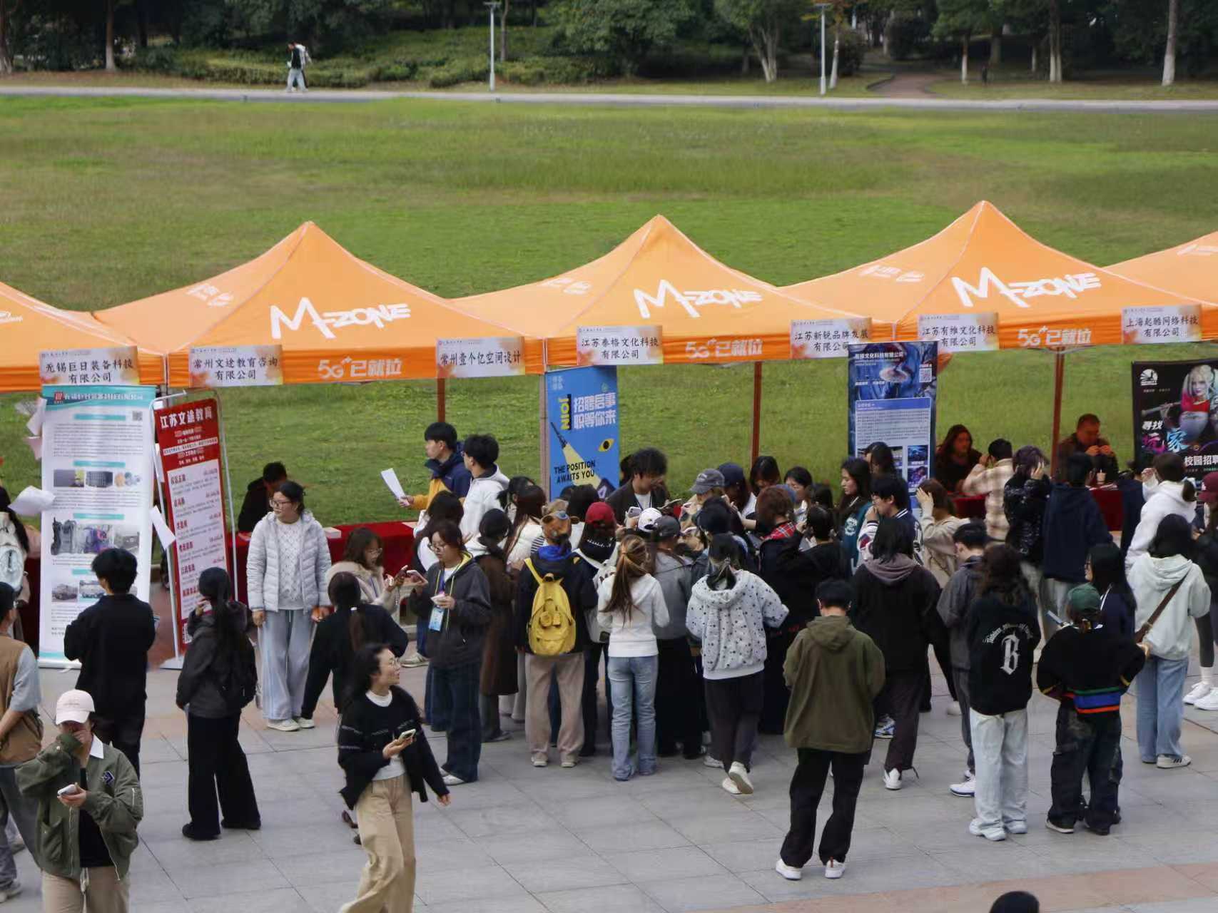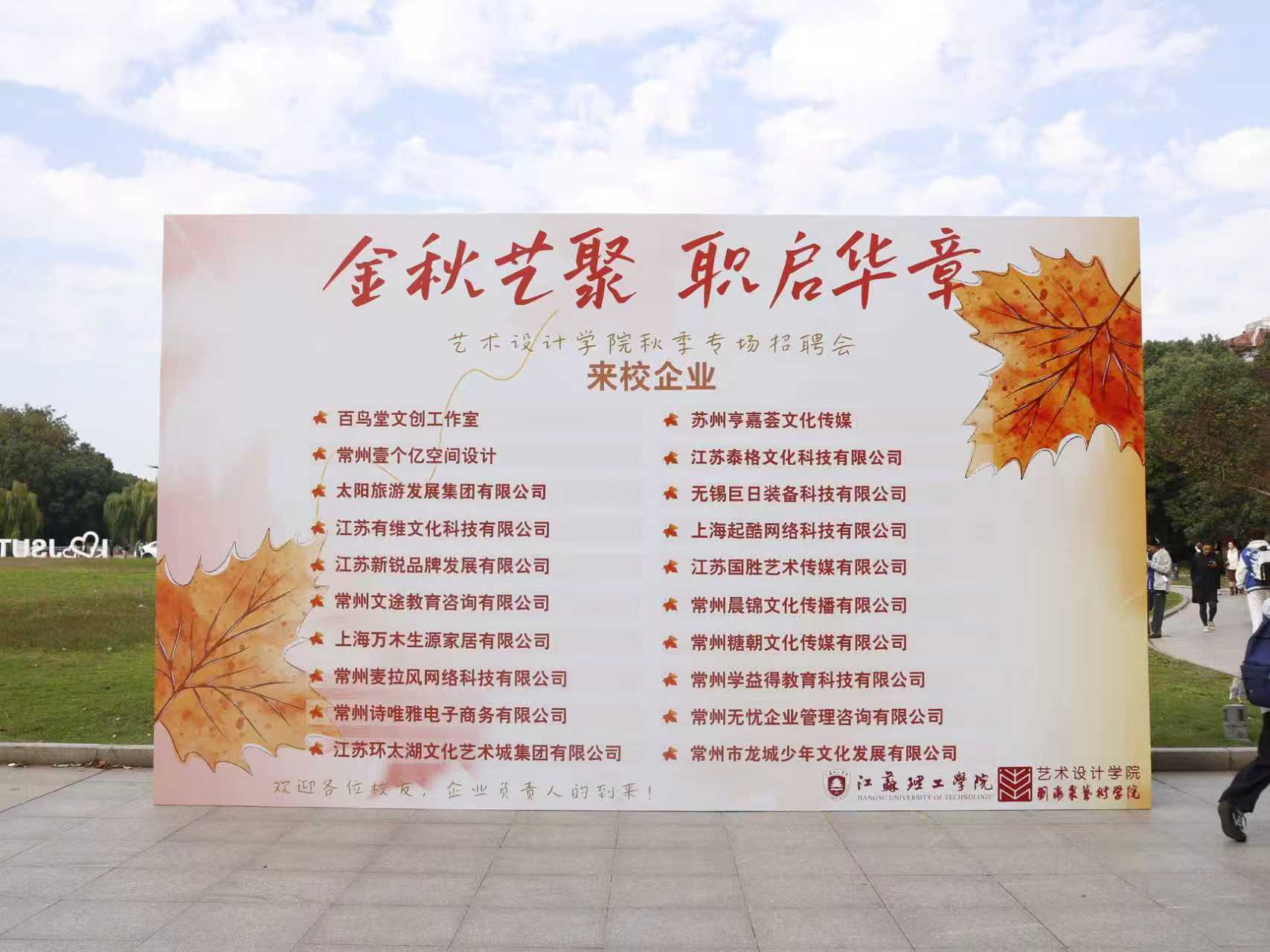 2025年11月12日,江苏理工学院艺术设计学院(刘海粟艺术学院)在图书馆广场举办“金秋艺聚、职启华章”2025年艺术设计学院秋季专场招聘会。此次招聘会特别邀请到校友企业“回家”揽才,为2026届毕业生搭建“传承与关怀”就业新桥梁。常州泰格文化科技有限公司、无锡巨日装备科技有限公司、上海万木生源家居有限公司等21家优质企业携100余个就业岗位来院参会。参会企业覆盖整个长三角,涵盖了教培、创意技术研发、数字动画制作、智能家居定制、创意产品设计、摄影工作室、影视制作、室内装饰设计等多个行业领域,精准对接我院美术与设计类各专业。学院党政领导深入招聘会现场与企业代表和毕业生亲切交流。