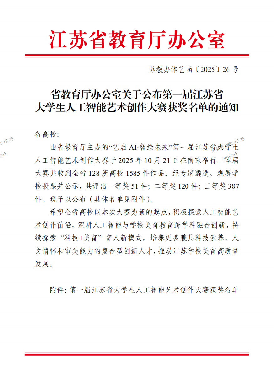近期,由江苏省教育厅主办的“艺启AI·智绘未来”第一届江苏省大学生人工智能艺术创作大赛评审结果公示。本次大赛共收到全省128所高校1585件作品。我院积极组织学生参赛,由冯裕良、易腾、杨木生、王星星等老师指导的学生作品中,赵双、颜梦娜、余任楠、喻诗敏、周均瑶、朱佳怡、周小柔、徐瑞琦、杨陈怡等同学获得二等奖共计6项;阮智辉、邓永清、黄乃杰、徐慧聪、周倩如、李婷婷、鲍余海、颜梦娜、余任楠、赵双等同学获三等奖共计5项。获奖作品涵盖人工智能绘画、设计、影像、音乐等门类,体现出我院在人工智能与艺术设计融合应用教学层面的积极探索。(图文/杨木生;审核/曹晋;编辑/穆彦兴)