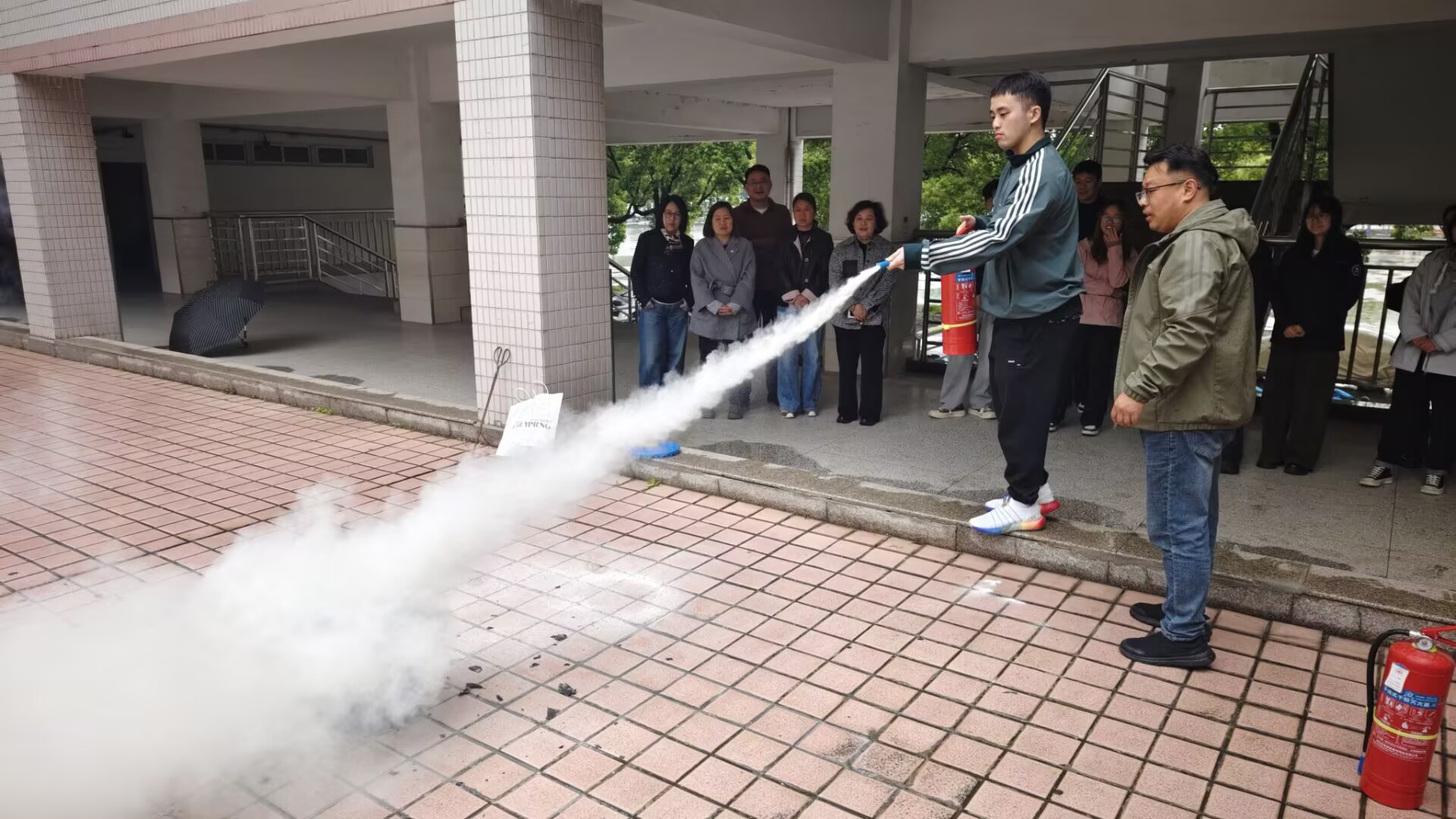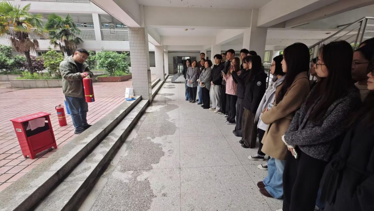 随后,全体人员前往室外开展消防安全实操演练。中心实验室主任余洋讲解了常用消防器材使用方法、实验室常见火情应急处置要点及注意事项。同学们有序操作灭火器,严格按照“提、拔、握、压、摆”步骤扑灭模拟火源,切实掌握实操技能。